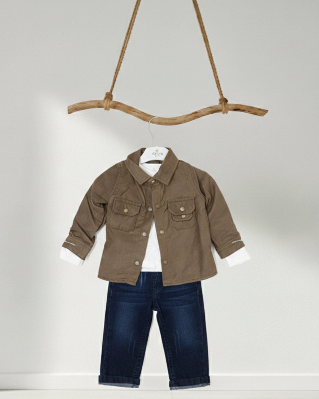 - Safari Tarzı Kanvas Ceket: Takımın ana parçası olan kahverengi ceket, fonksiyonel ve şık tasarımıyla öne çıkar. Göğüs kısmındaki çift kapaklı ve düğmeli cepler, gerçek bir safari ceketi estetiği sağlar. Dayanıklı ancak yumuşak dokusu, bebeğinizi rüzgardan korurken hareketlerini kısıtlamaz.
