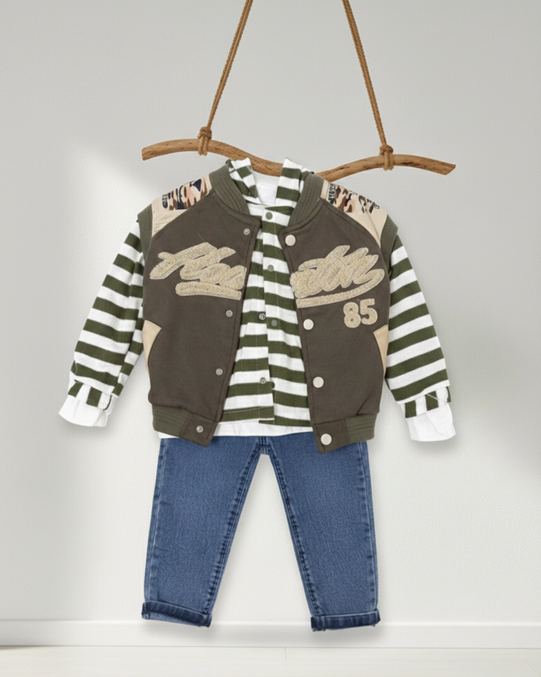Baby Çocuk Kolej Tarzı Bomber Yelekli Ve Çizgili kapüşonlu 4’lü Denim Takım DGE 11