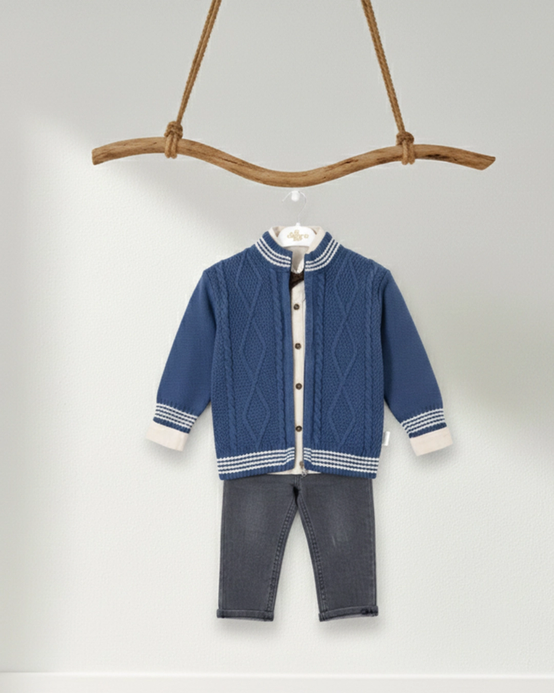 Bebeğinizin en özel günlerinde hem bir beyefendi şıklığına sahip olmasını hem de pamuksu bir konfor içinde hareket etmesini ister misiniz? DenoGo markasının bu özenle hazırlanan 3’lü takımı, geleneksel örgü dokusunu modern denim tarzıyla birleştiriyor.