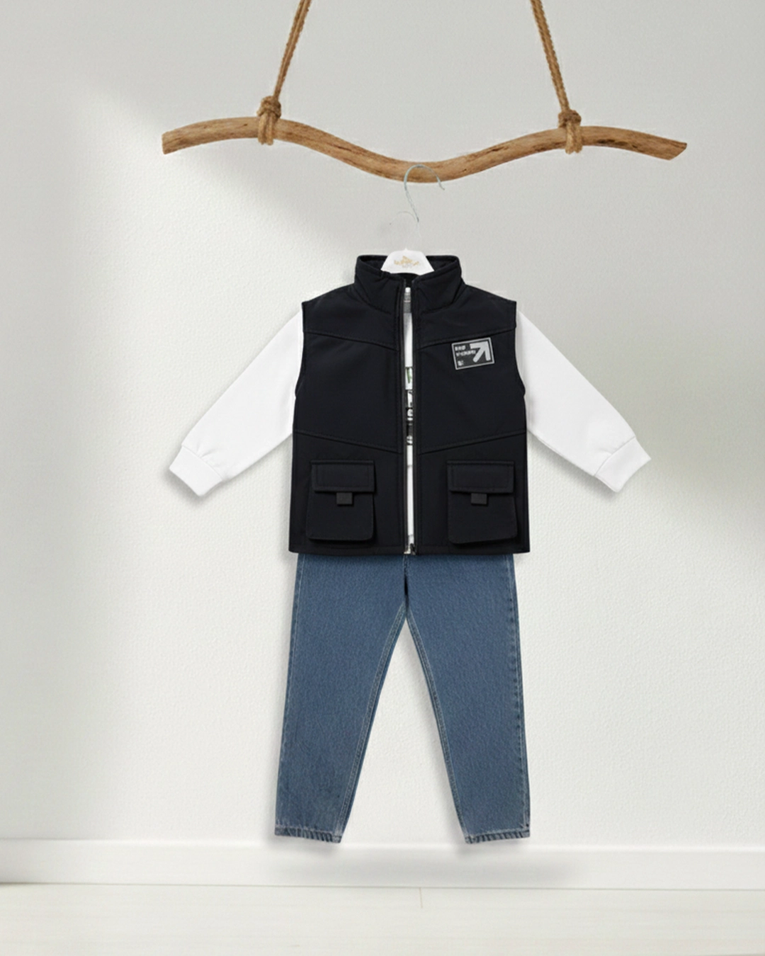 - Uzun Kollu Beyaz Üst: Yeleğin içine giyilen beyaz sweatshirt, yumuşak dokusuyla bebeğinizin cildini sarar. Ribanalı manşetleri sayesinde kolların kaymasını önler ve sıcak tutar.